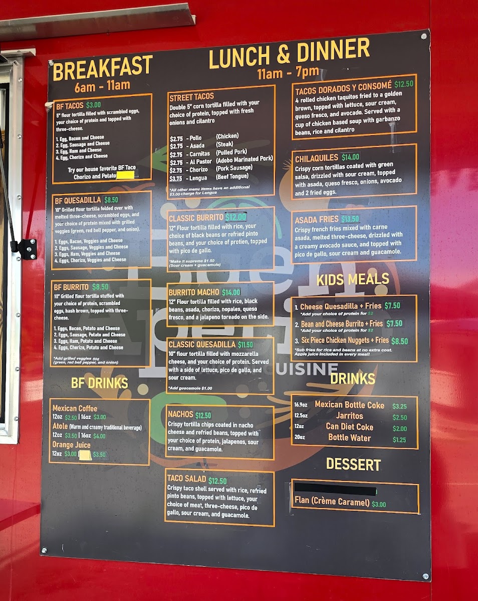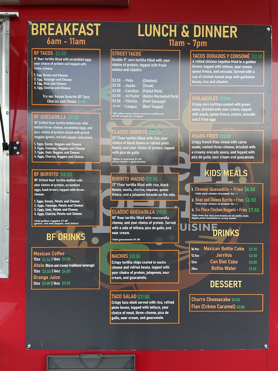 Buen Apetito LLC offers a vibrant menu filled with flavorful Mexican dishes that cater to a variety of tastes. For drinks, they feature refreshing 12.5 Oz Jarritos as well as traditional Atole and Mexican Coffee in different sizes. The breakfast section shines with hearty options like Breakfast Tacos filled with Bacon, Chorizo, Sausage, Ham, and Papa. For a more substantial meal, their Classic Burritos are a standout, offering fillings such as Al Pastor / Adobo Pork, Asada / Steak, Lengua / Beef Tongue, Carnitas / Pulled Pork, and Chorizo / Pork Sausage. The Breakfast Burritos and Breakfast Quesadillas are perfect for those looking for a satisfying start to the day, with fillings like Sausage, Ham, Bacon, and Chorizo. Sides like Chips, Grilled Jalapeño, and Creamy Avocado Salsa complement the meal, while the Street Tacos showcase the same delicious fillings available in burritos and quesadillas, such as Pollo, Lengua, and Asada. For those craving a crispy treat, the Nachos come in various options, including Al Pastor, Chorizo, Carnitas, Pollo, and Asada. The menu also features unique dishes like Tacos Dorados Y Consomé, Chilaquiles, and Burrito Macho, as well as a tasty Taco Salad with choices like Lengua, Asada, Pollo, and Carnitas. Kids can enjoy a simpler option with the Kids' Bean And Cheese Burrito. Whether you’re looking for a quick snack or a filling meal, Buen Apetito offers an extensive range of flavorful Mexican cuisine.